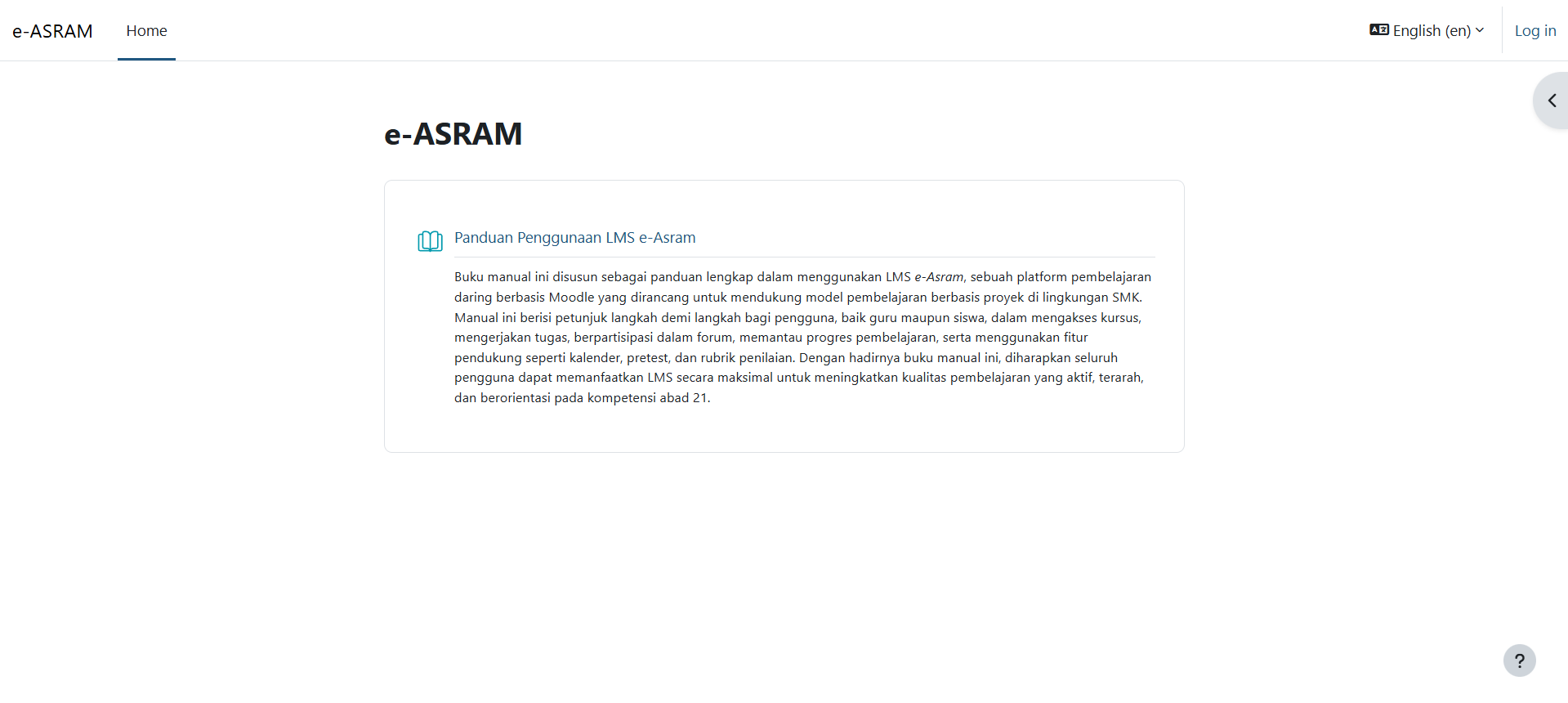 Buku manual ini disusun sebagai panduan lengkap dalam menggunakan LMS e-Asram, sebuah platform pembelajaran daring berbasis Moodle yang dirancang untuk mendukung model pembelajaran berbasis proyek di lingkungan SMK. Manual ini berisi petunjuk langkah demi langkah bagi pengguna, baik guru maupun siswa, dalam mengakses kursus, mengerjakan tugas, berpartisipasi dalam forum, memantau progres pembelajaran, serta menggunakan fitur pendukung seperti kalender, pretest, dan rubrik penilaian. Dengan hadirnya buku manual ini, diharapkan seluruh pengguna dapat memanfaatkan LMS secara maksimal untuk meningkatkan kualitas pembelajaran yang aktif, terarah, dan berorientasi pada kompetensi abad 21.