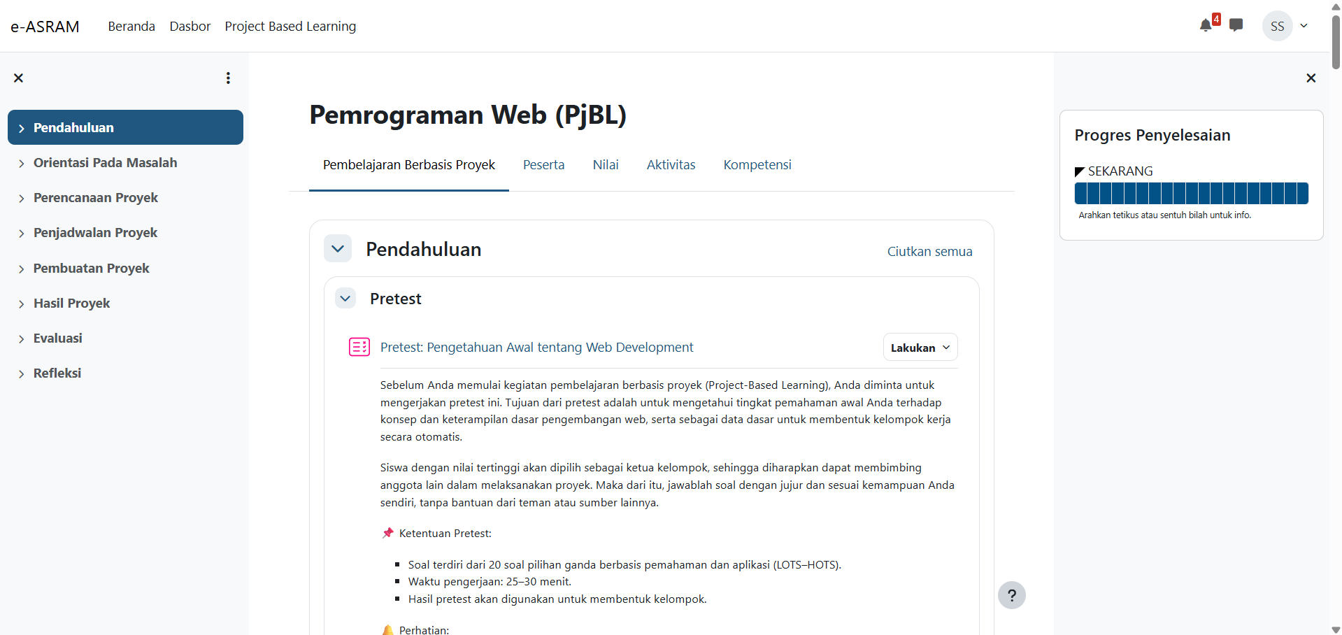 - Pada tampilan kursus Pemrograman Web (PjBL) berisi langkah-langkah pembelajaran/syntax menggunakan metode Project Based Learning, dimana pembelajaran ini dilakukan secara berurutan dan sistematis. Berikut ini tampilan kursus Pemrograman Web (PjBL).